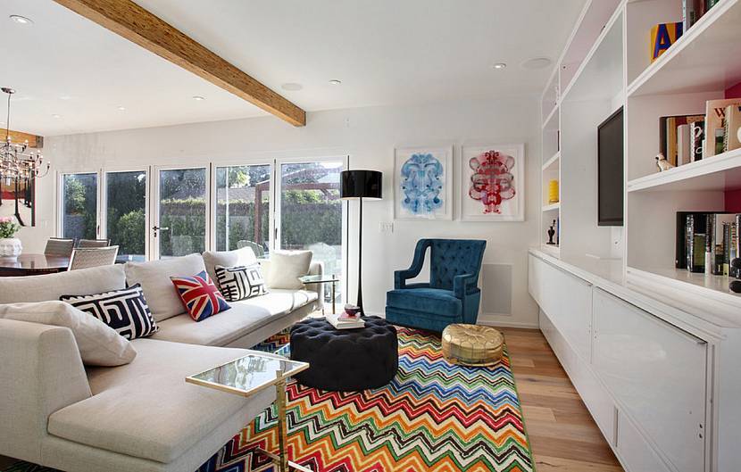 Лаконичная линейная вариация интерьера. Яркие пятна на бежевом фоне как стильные цветовые акценты.