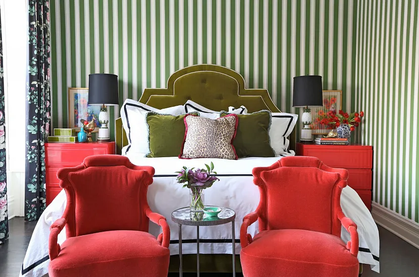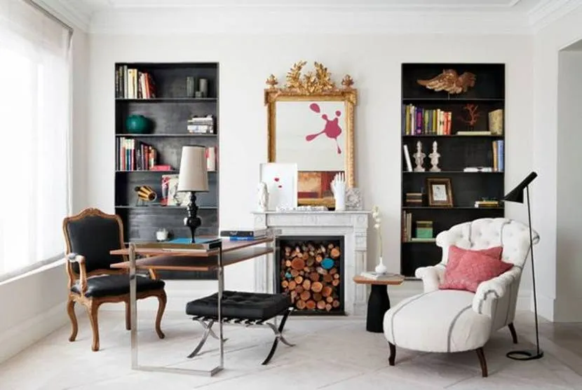 - Наличие яркого объекта, делающего акцент. Это может быть вставка на обоях, интересный письменный столик или оригинальная обивка на диване.