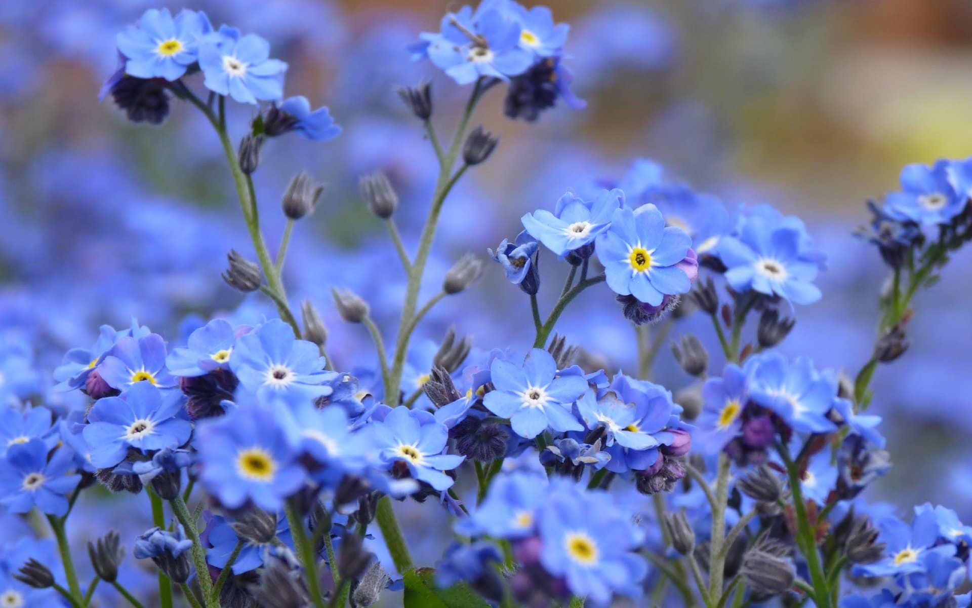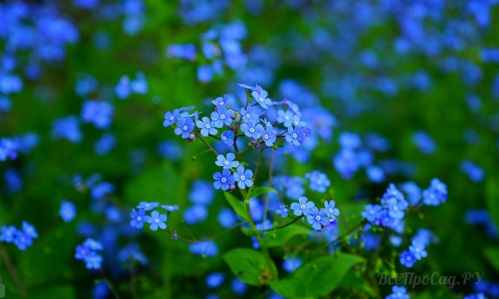 Любит влажную почву и затененные участки. Нежно-голубые соцветия, яркая листовые пластинки в виде сердца. Невысокие, 25-сантиметровые кустики с длинными листьями и небесно-голубыми мелкими цветочками, закрывающие свои лепестки после захода солнца. Незабудка украшает сад цветением с мая по июль.