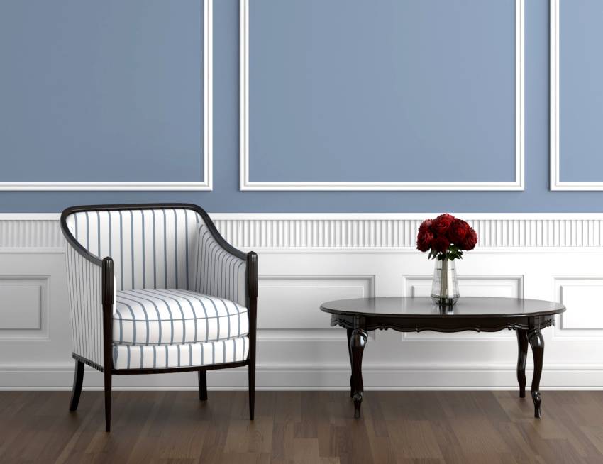 Также стоит окрасить молдинги в отличный от стены цвет, если они служат для разграничения двух разных вариантов отделки (актуально для ситуаций, когда, к примеру, нижняя часть стены оклеена одними обоями, а верхняя — другими).