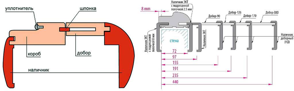 Вся «телескопичность» наличников сводится к установке их на подрезаемые по месту доборные элементы, жестко связанные с рамой окна. Надежнее всего наличники на пазовых доборах, слева на рис. Телескопические системы наличников с пазом в раме (напр., справа на рис.) не предназначены для наружной установки: порывом ветра наличник может выломать, сломав заодно и раму.