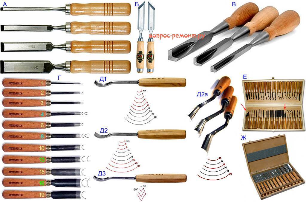 Гораздо больше потребуется полукруглых стамесок, поз. Г: для начала 4, 8, 13 и 16 мм нормальных, с глубиной желоба, равной его ширине. 4 и 8-мм стамески нужны будут также глубокие, т. наз. U-образики, а 13 и 16-мм еще и отлогие.