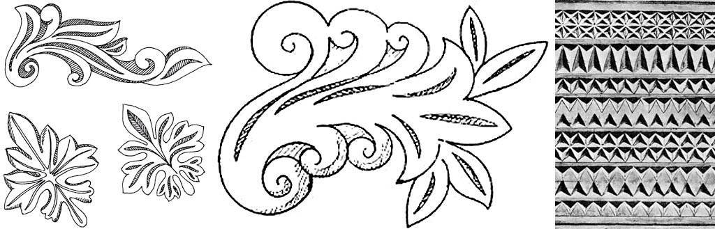 Искать стамески для резьбы по дереву нужно в художественных магазинах, но покупать все первоначально необходимые вразброс обойдется очень дорого. Лучше сразу взять набор для резьбы по дереву, но не для тонкой скульптурной из 40-60 предметов (поз. Е), он не дешевле обойдется, а вам на первых порах просто непонятно будет, что большинством этих инструментов делать. Нужно брать набор для начинающих из 12-15 предметов, поз. Ж, к нему надо будет только прикупить ножи-косяки на 90 и 60 градусов (показаны стрелками на поз. Е). Инструментами из такого набора можно будет облагородить вырезные накладные элементы и выполнять довольно тонкую геометрическую резьбу, см. рис.: