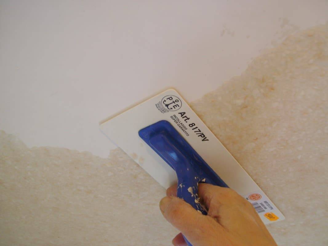 - Небольшими участками по поверхности разравнивается материал с толщиной слоя 1–3 мм. Работают широким шпателем или кельмой, которые создают слой без текстуры, а узоры формируются валиком или специальной тёркой. Это необходимо сделать до застывания слоя.