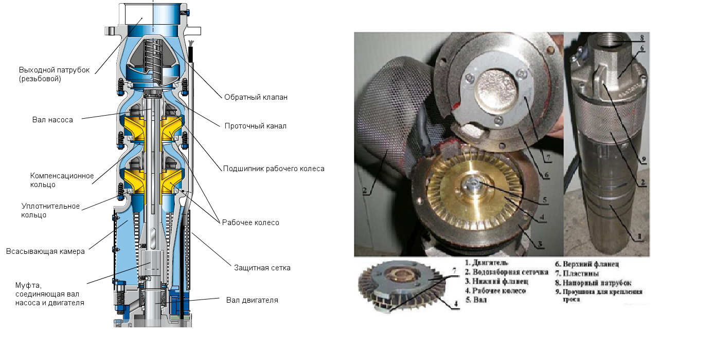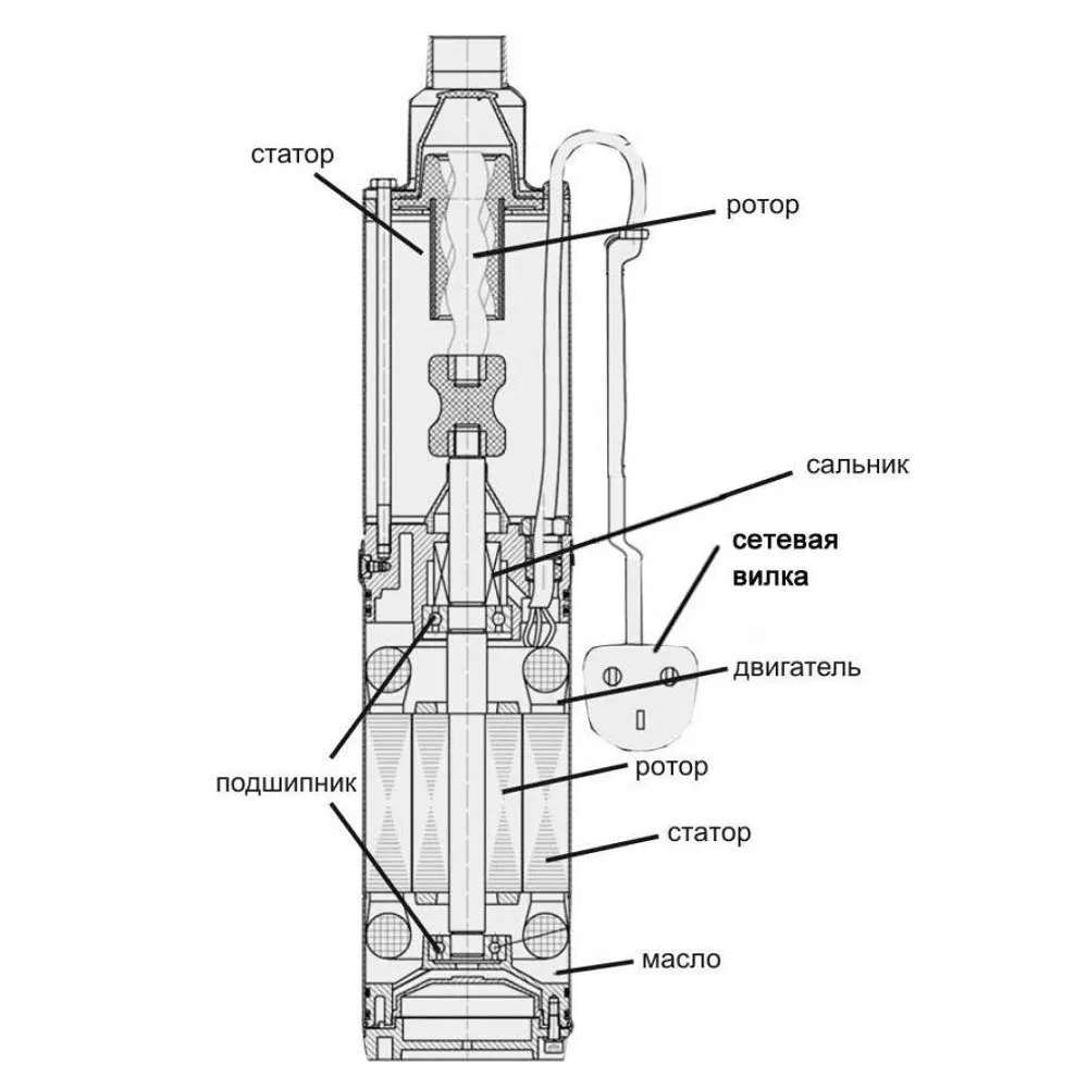Наверх отправляется труба или шланг для подачи воды, провод для подведения питания на электродвигатель.