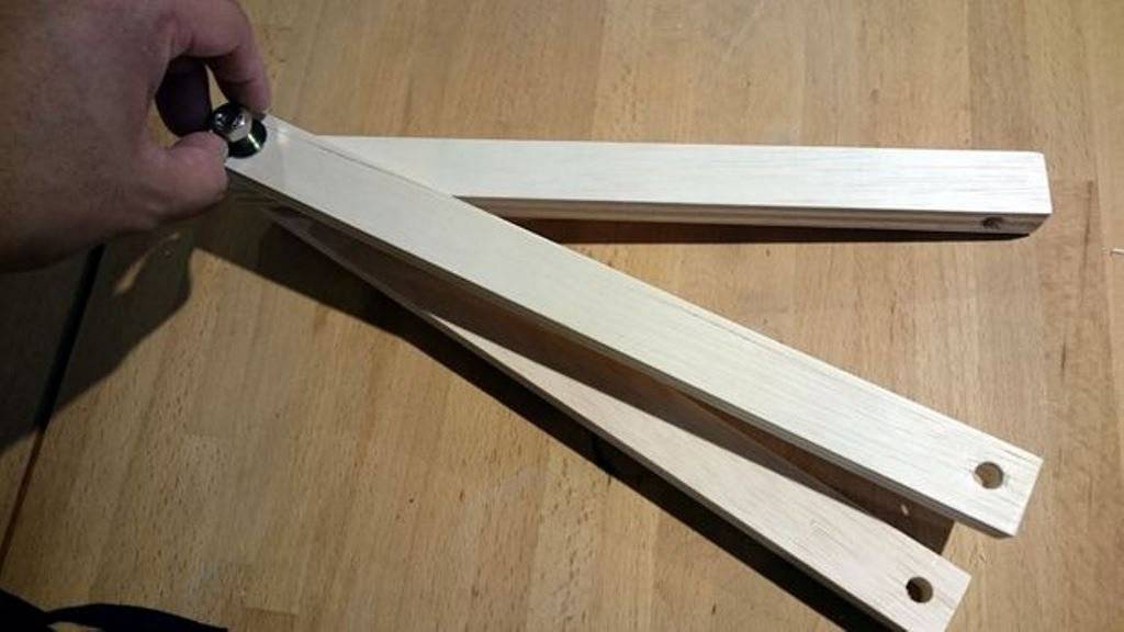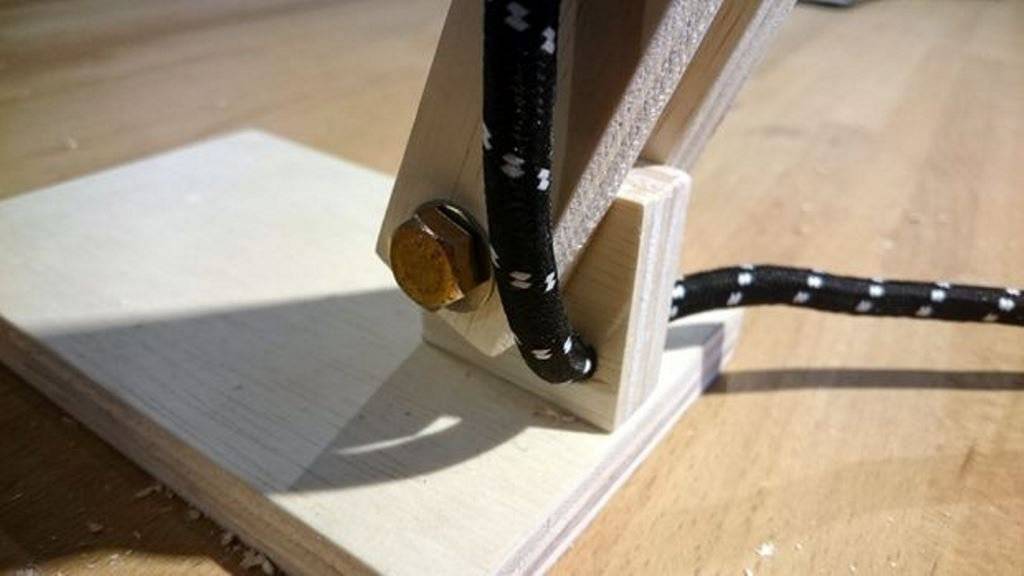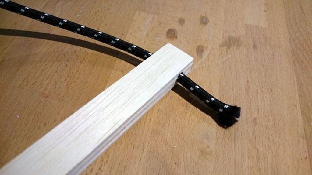 Два отверстия для шнура сверлятся через глубину фанеры на одном из деревянных брусков. От конца фанеры отступать около 5 см. Затем соедините все бруски вместе с помощью болта, двух шайб и гайки. Проверьте, чтобы перпендикулярные отверстия не перекрывались.