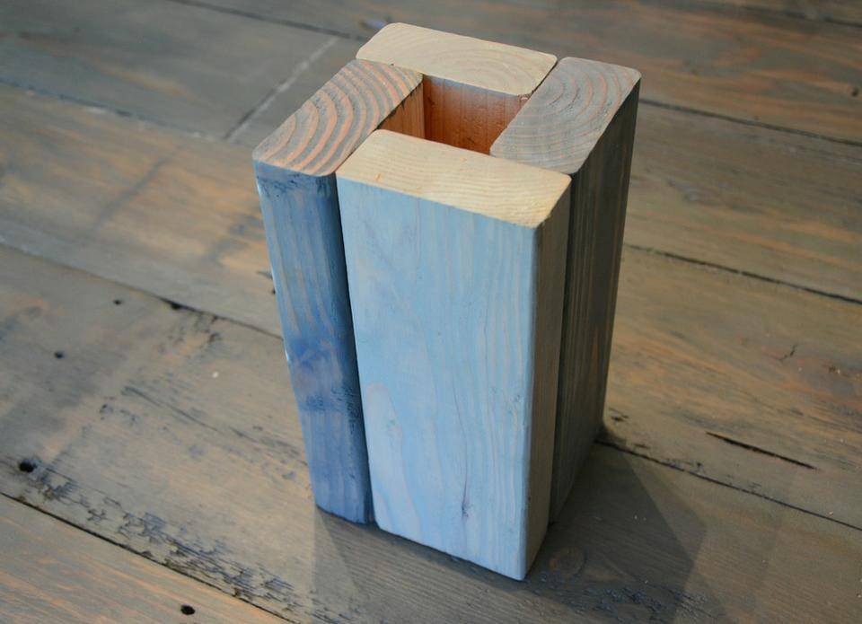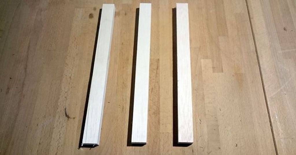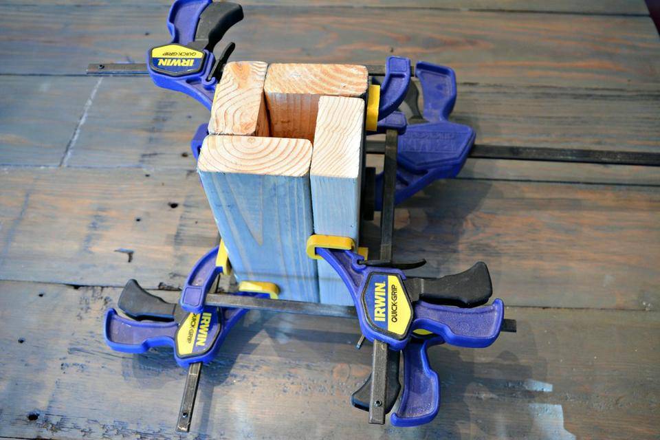 Распилите доску сечением 50×100 мм на 4 отрезка нужной длины. В нашем случае длина отрезков составила 220 мм. Дощечки можно покрыть морилкой или покрасить в желаемый цвет. Склейте дощечки столярным клеем и зафиксируйте их с помощью струбцин.