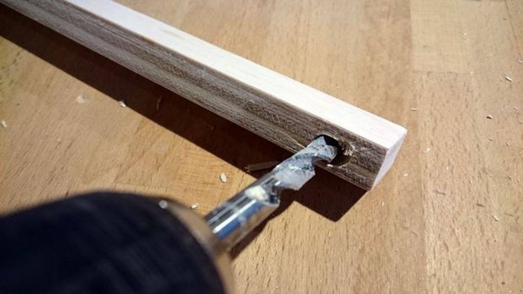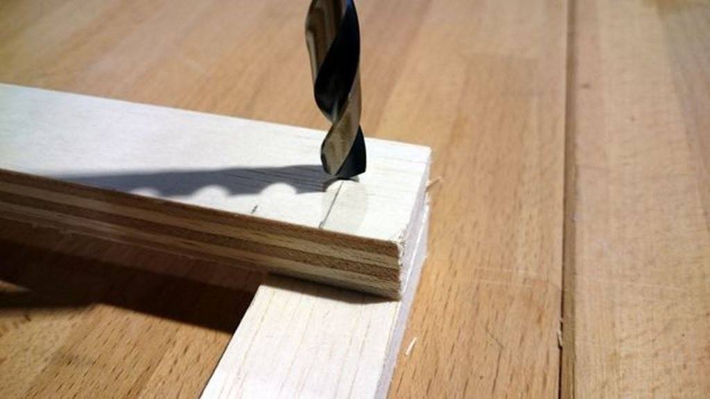 Этап 2: Сверление отверстияСовместите два бруска в концах под углом 90 градусов. Отметьте центр их пересечения, и просверлите отверстия. Таким же образом просверлить еще 3 дырки. На третьем куске должно быть только одно отверстие