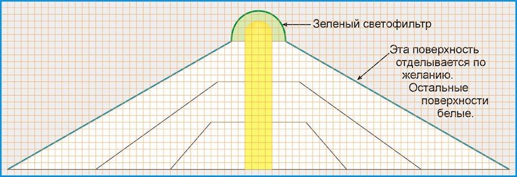 В наше время почти полный светотехнический аналог «зеленой лампы» можно сделать своими руками. Дают такую возможность лампочки-экономки на цветовую температуру в 4300K с U-образными сегментами колбы и белоснежная акриловая эмаль для ванн. Схема устройства поликонического абажура самодельной «зеленой лампы» дана на рис. Его размеры привязаны к высоте колбы лампочки – источника света, для чего на рис. нанесена координатная сетка. Зеленый светофильтр – из ПЭТ. Отражатели сворачиваются из тонкой жести. Наружный шов на верхнем маскируется наклеенной на него полоской ПВХ. Симметрично ей относительно вертикальной оси наклеиваются еще 2-3 таких же полоски через 120 или 90 градусов. Стойка – любая, и символ покоя, уюта, вдохновения готов.