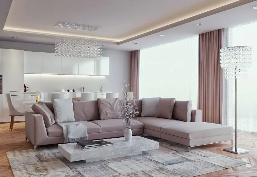 Подобный метод зонирования гостиной относительно новый и ещё набирает популярность. Такая мебель состоит из различных блоков, которые без особых усилий можно переносить с места на место, менять количество деталей.