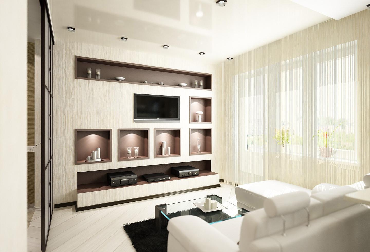 Оформив глухую стену с помощью декоративных ниш из гипсокартона, где можно расположить телевизор, декоративный камин, интересные и нужные предметы интерьера, цветы, книги, отпадает необходимость покупки корпусной мебели.