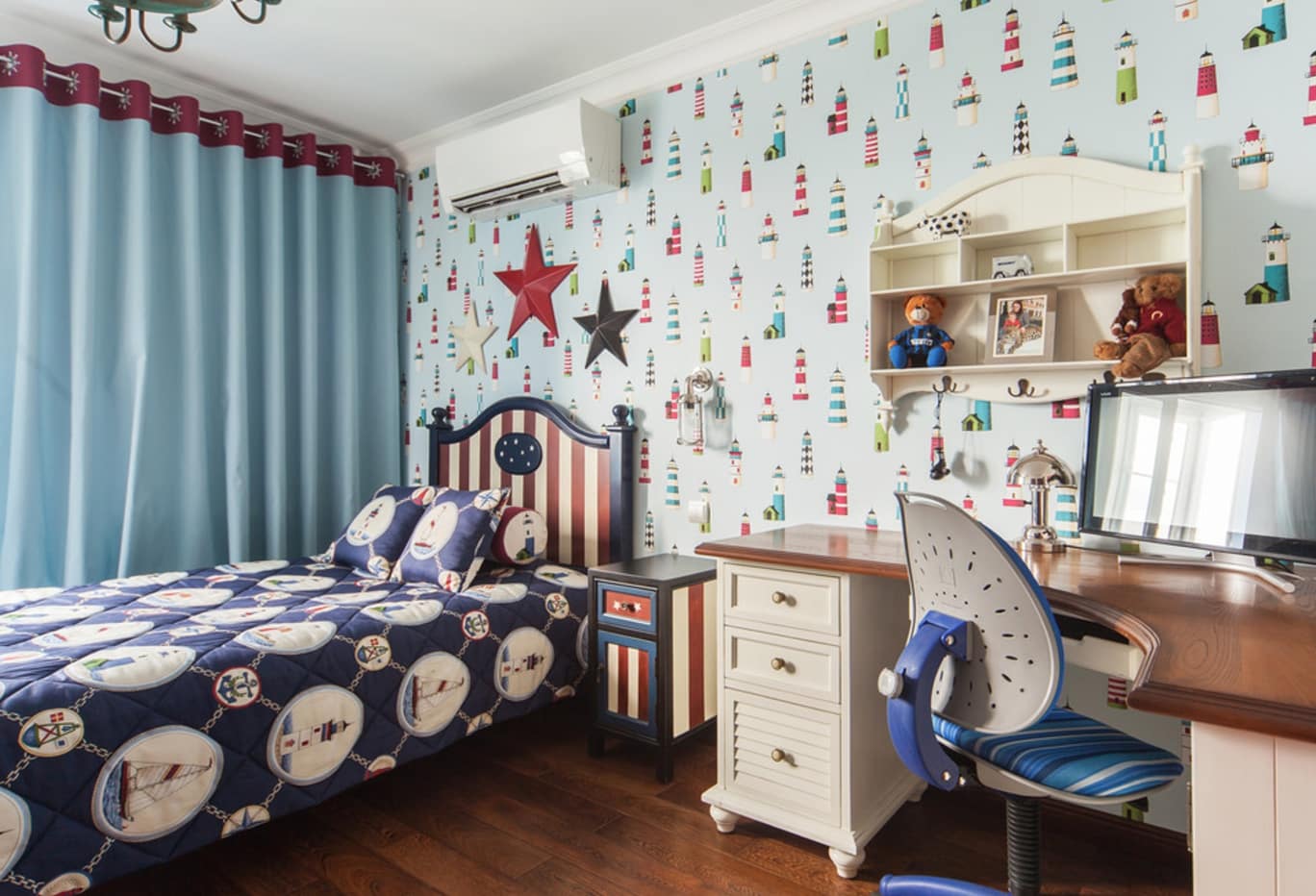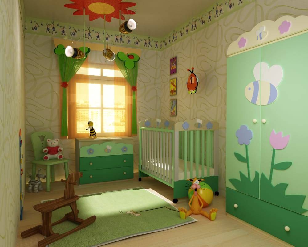 Часто в этой комнате прибегают к зонированию, выделяя участки для разных видов деятельности малыша. В зоне сна приклеиваются обои спокойных оттенков, например, светло-голубого, бежевого, нежно-желтого.