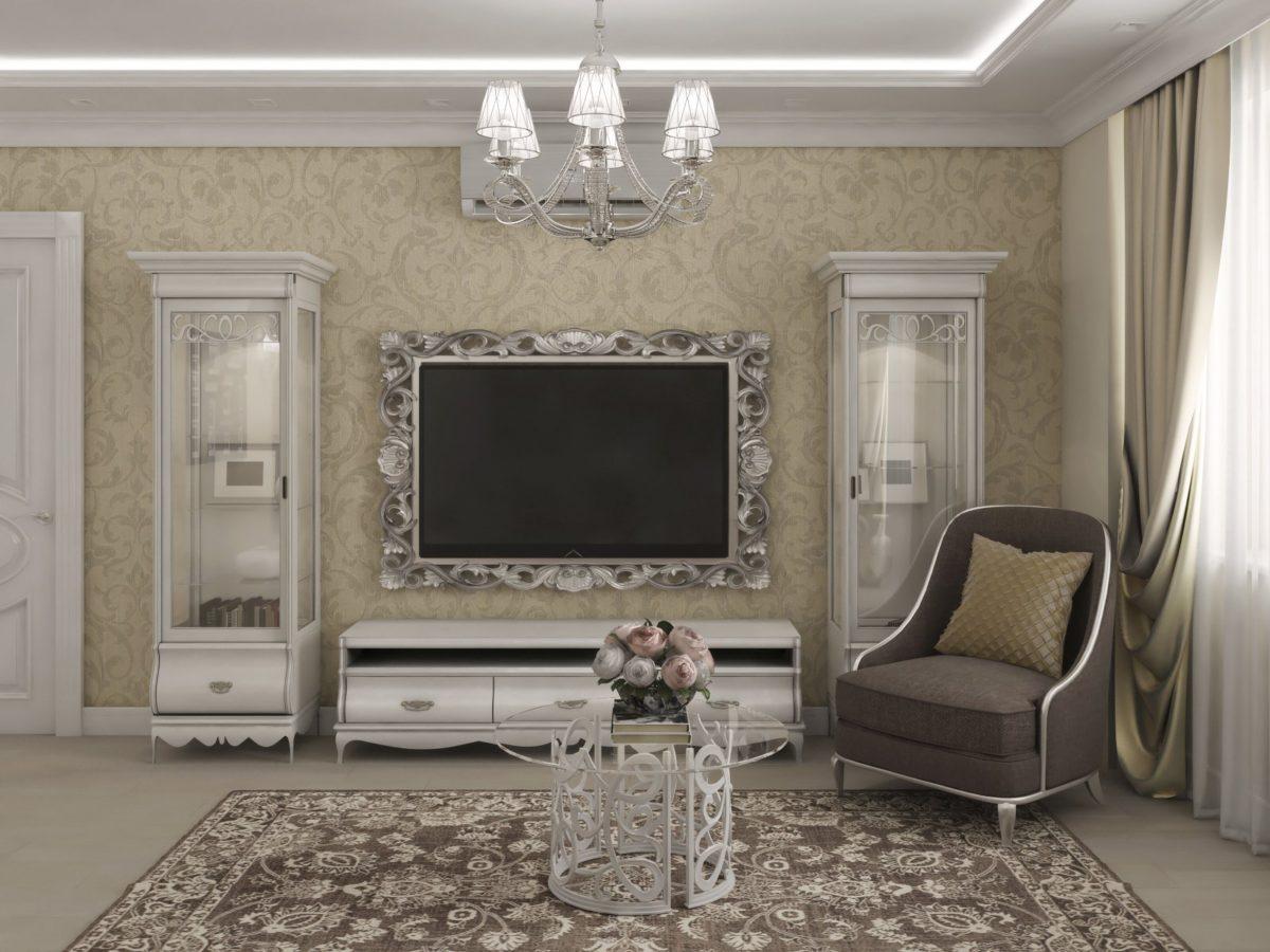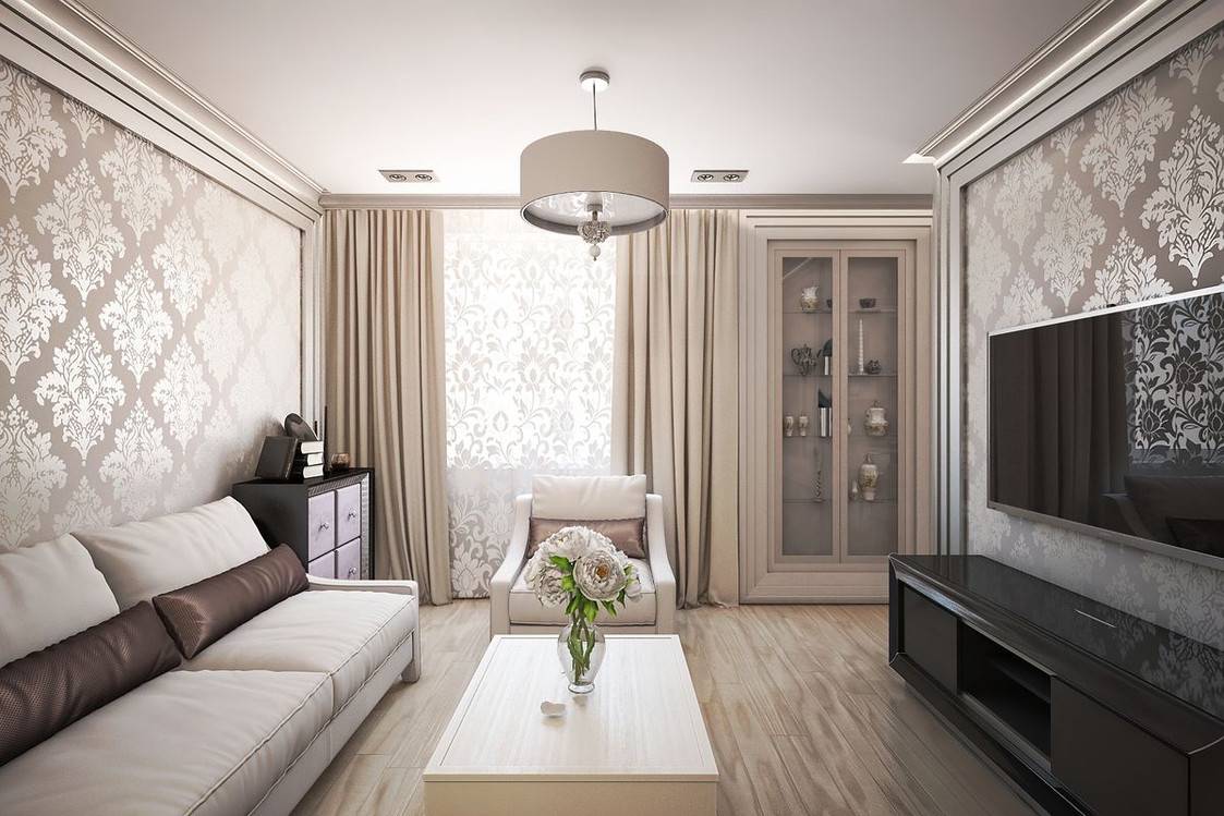 На фото пример маленького зала, в котором на стенах скомбинированы обои из одной коллекции. Акцентная стена выделена обоями с орнаментом.