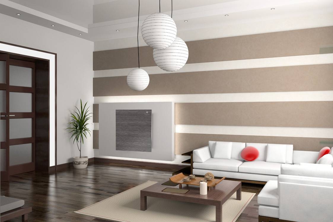 В зависимости от принципов размещения полос на стенах прослеживается ориентация на определенные стили в интерьерах гостиной. Например, вертикальное совмещение материалов в форме «зебры» характерно, прежде всего, для современных направлений: помимо модерна и хай-тека, такой способ станет отличной возможностью декорирования минималистических комнат.