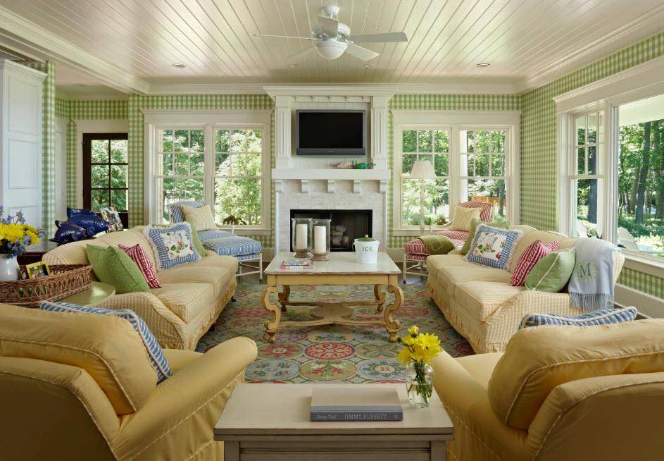 - В стилистике кантри чаще всего используют клетку, полоску, мелкий цветочный узор для оформления стен.