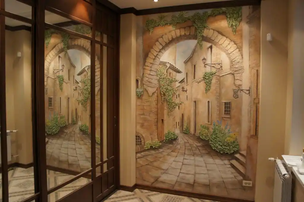 Изображение городских улиц на стене в прихожей.