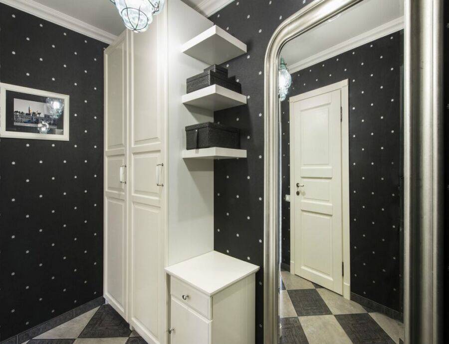 Зонирование небольшой прихожей обоями и шкафом.