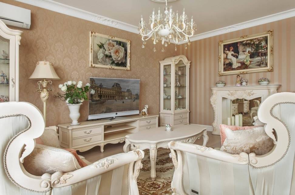 На фото пример маленького зала, в котором на стенах скомбинированы обои из одной коллекции. Акцентная стена выделена обоями с орнаментом.