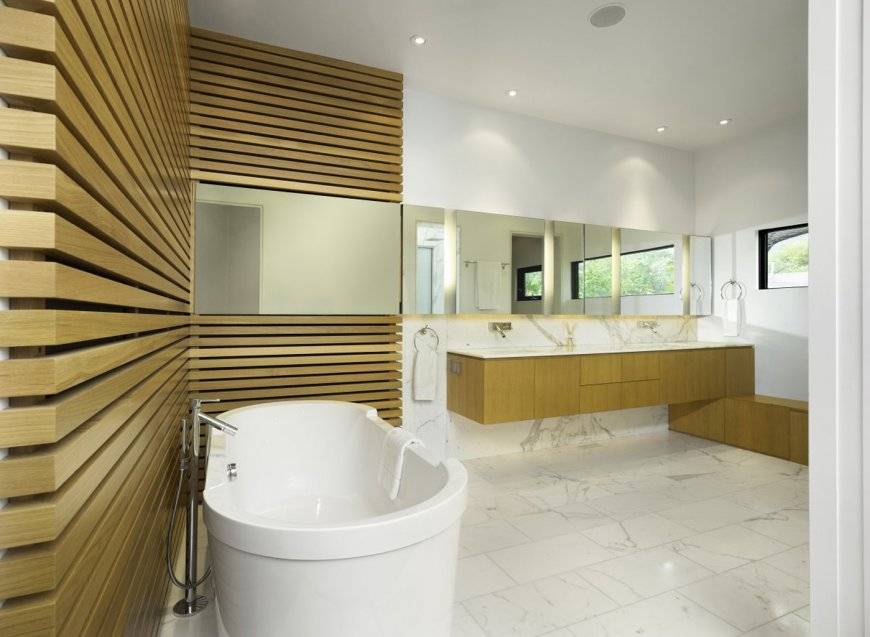 Модный тренд – акцентная стена напротив раковины или ванны для выразительного контраста и глубины.