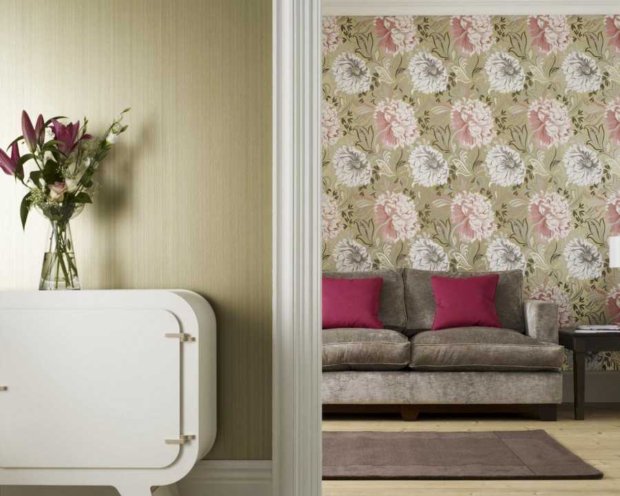 - Для зала, оформленного в стиле «модерн», подойдут обои пастельных оттенков. Это современное направление многое заимствует у природы, поэтому цветочная роспись на обоях здесь будет кстати.
