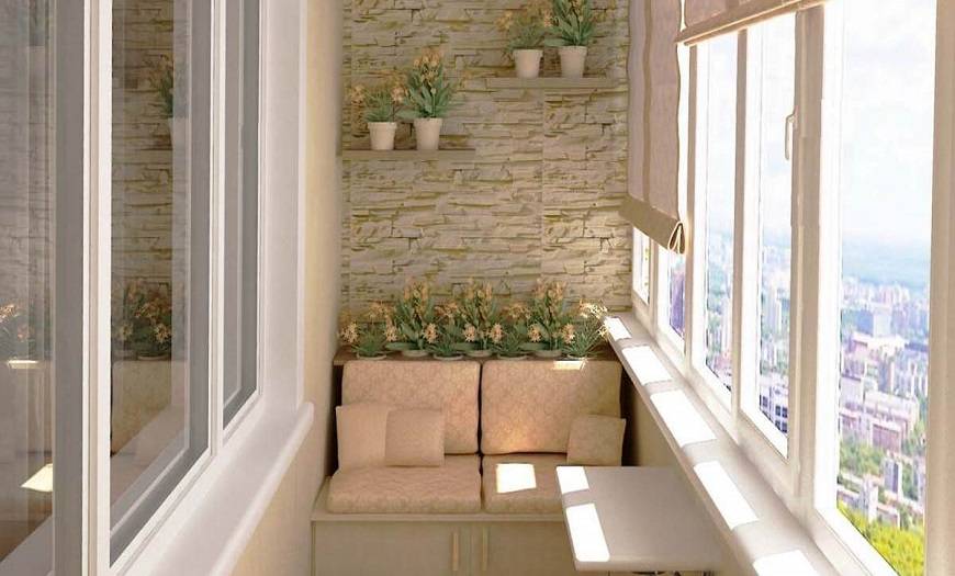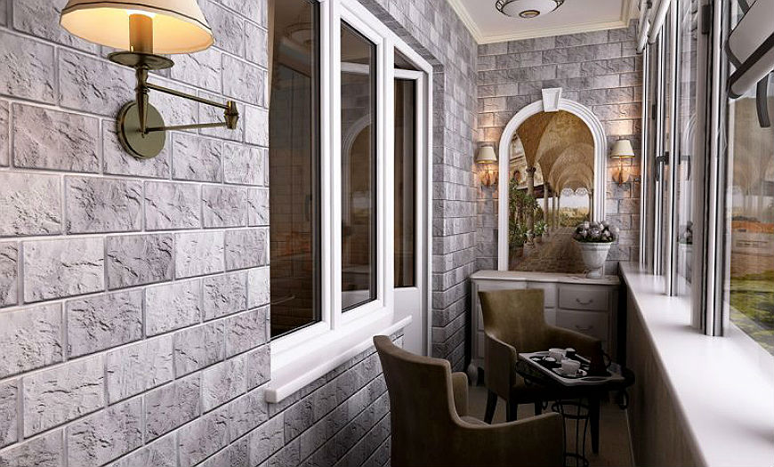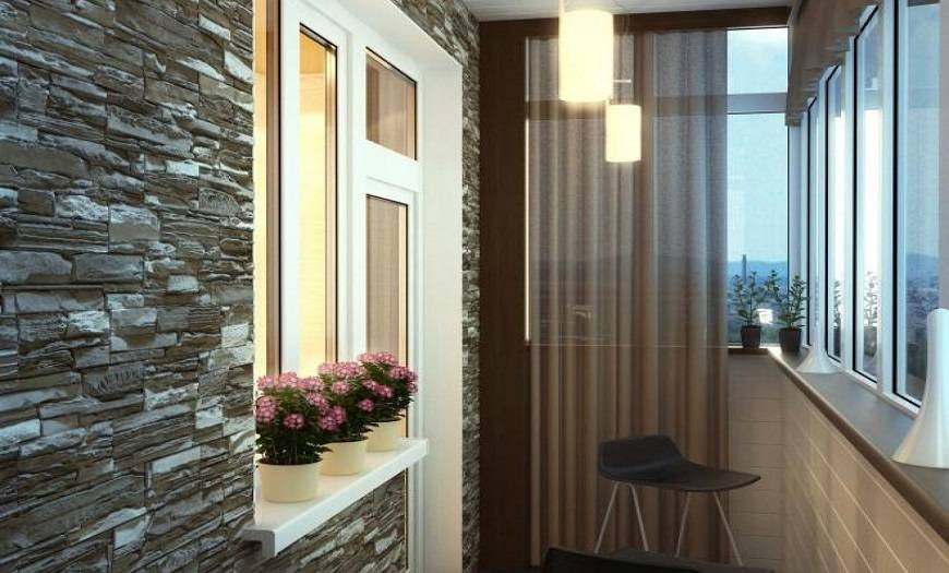 В современном дизайне лоджии часто сочетают натуральные фактуры: камень и окрашенную деревянную вагонку.