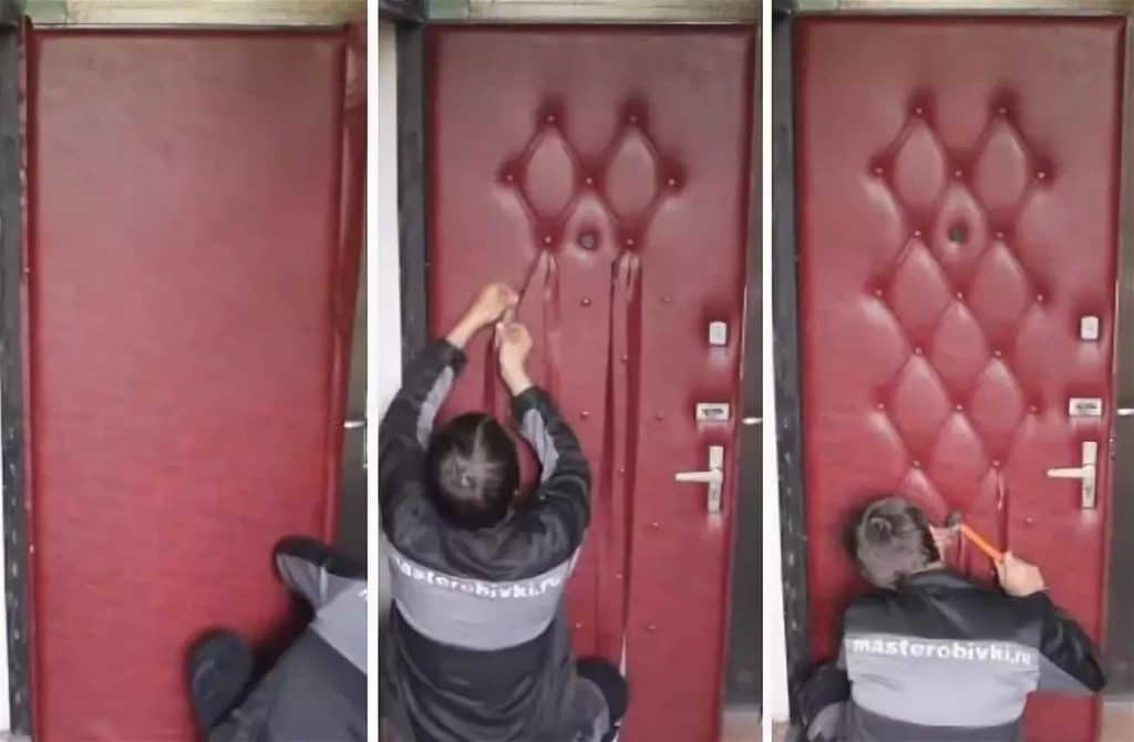 Самый популярный способ обшивки двери — при помощи искусственной кожи. Такая отдела позволяет одновременно с улучшением внешнего вида повысить показатели тепло- и звуко- изоляции. Но есть у этого типа обивки дверей и минусы — это самый сложный технологический процесс, требующий хотя-бы общих представлений о порядке действия.