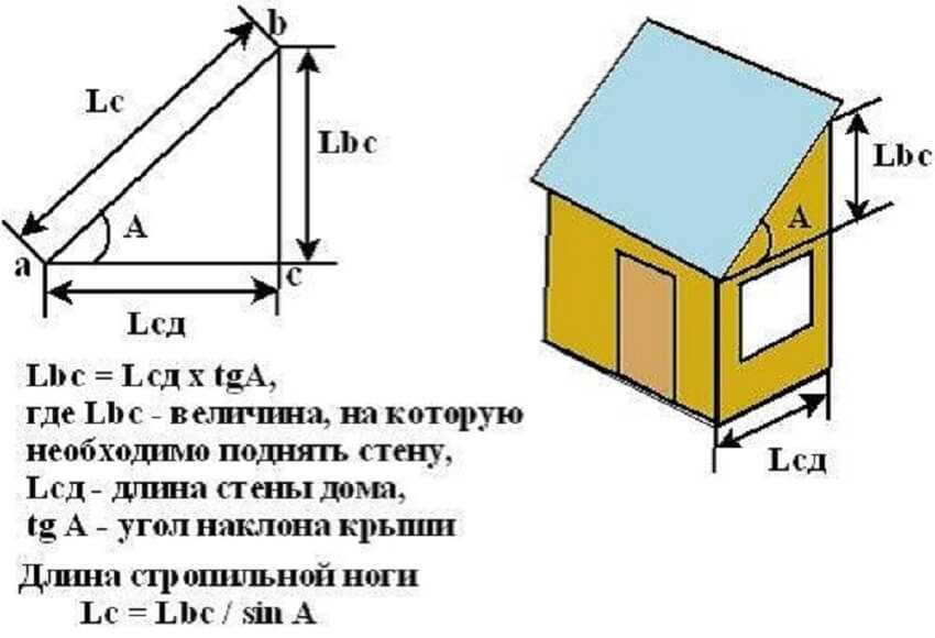 Чтобы обеспечить найденный угол уклона односкатной кровли, необходимо одну из стен поднять выше. Насколько выше узнаем, вспомнив формулы расчета прямоугольного треугольника. По ним находим и длину стропильных ног.