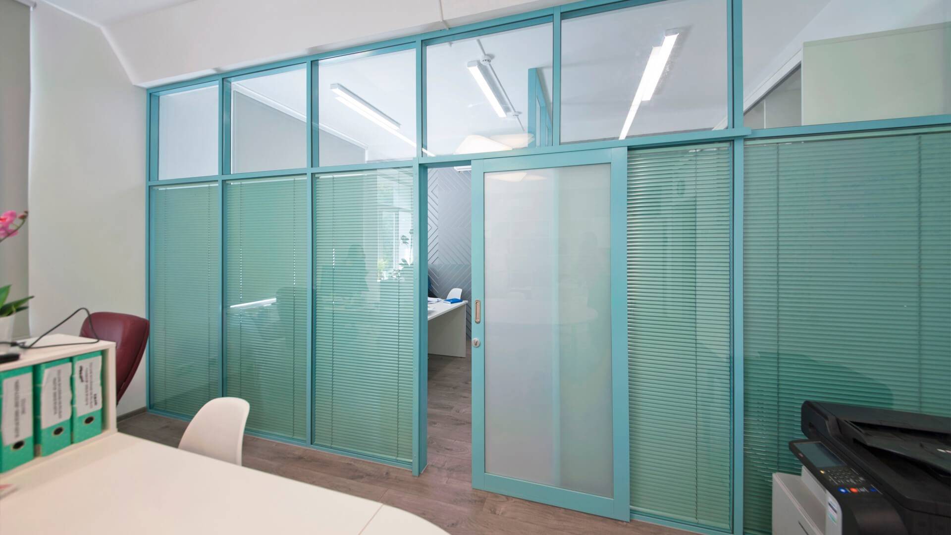 Это самые популярные наши серии – как раз те, с помощью которых можно создать любое закрытое помещение – от крупного кабинета до кабинки раздевалки. Основные материалы для таких перегородок – стекло и панели из ЛДСП или МДФ. Их можно комбинировать в любом соотношении: например, если в помещении не хватает света, нижнюю часть перегородки изготавливаем из панели, а верхнюю – из стекла. Полностью глухие перегородки фактически выполняют роль стен – в них встраиваются двери, а уровень шума они снижают практически так же, как стены из гипсокартона.