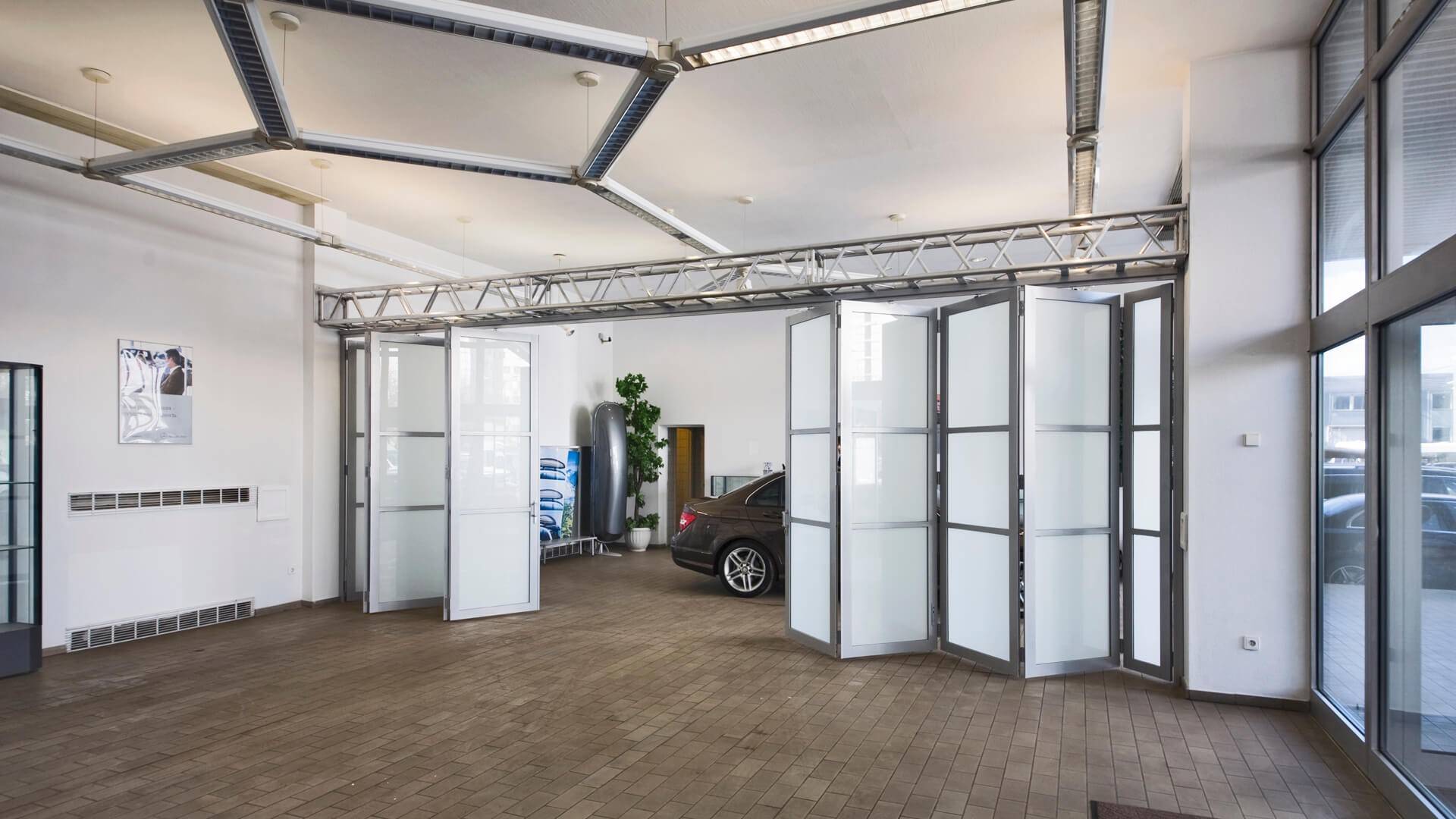 Основное отличие – профиль перегородок фиксируется так, что их расположение можно легко менять – раскладывать и складывать (или сдвигать, в зависимости от серии) по необходимости. Такие перегородки применяются там, где одно и то же помещение в разное время используется по-разному. Это не только переговорные и зоны отдыха в офисах, но и классы и актовые залы учебных заведений (включая школы и детские сады), шоурумы, выставочные комплексы, автосалоны и так далее. Часто такие перегородки становятся оптимальным решением в помещениях, которые должны соответствовать СНиПам (например, столовых и кухнях на предприятиях общепита): для соблюдения требований перегородка выполняет роль стены, но при необходимости она легко складывается.