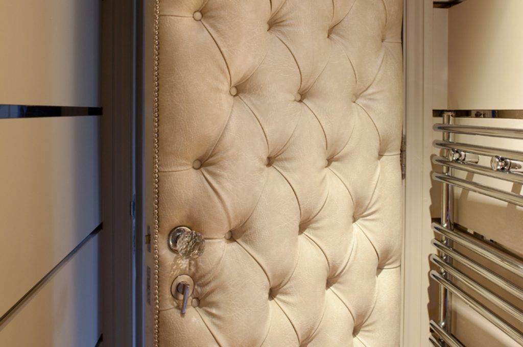 Обивка внутренней части двери кожей или заменителями натуральных материалов с набивкой внутреннего пространства упругими вставками, например, ватином. Такой вариант отделки значительно повышает сопротивление теплопередаче ограждающей конструкции.