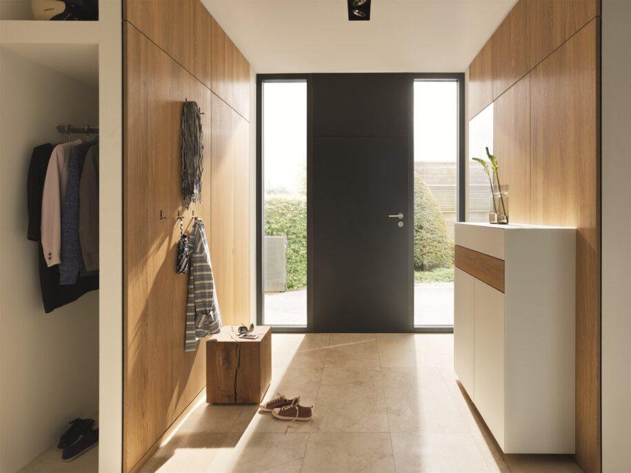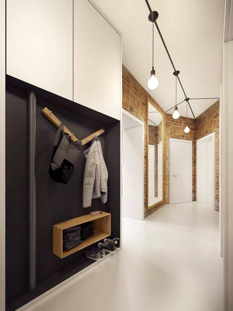 Главный недостаток — отсюда хорошо видны все комнаты в квартире. Чтобы решить эту проблему, нужно закрыть дверь каждой из комнат. Наиболее распространенный способ перепланировки коридора такого типа — разделение его на две функциональные зоны.