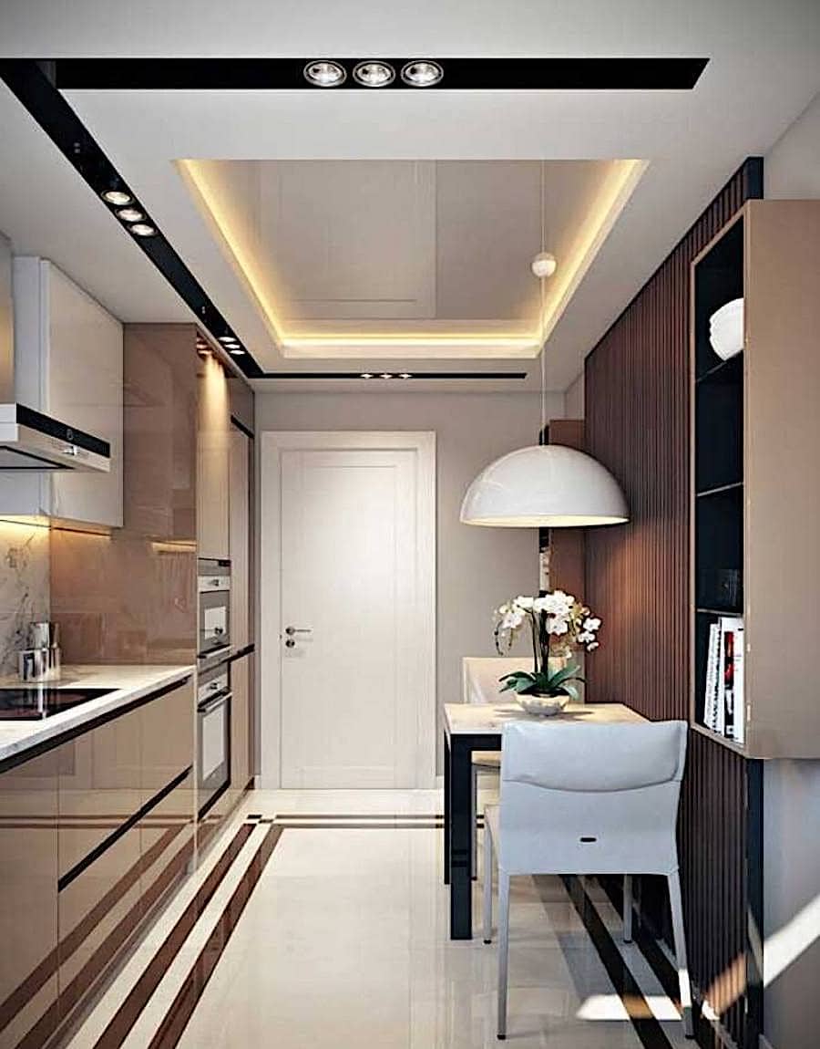 Обрати внимание на пластиковые панели, которые можно окрашивать или имитировать любой другой материал. А многоуровневые гипсокартонные конструкции позволяют удобно разграничить пространство и выделить рабочую или обеденную зону