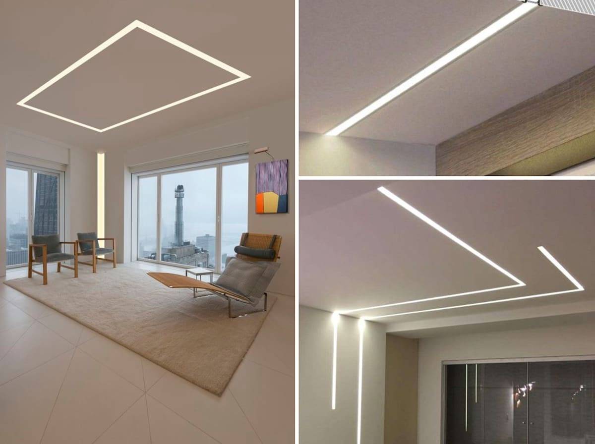Натяжное полотно при всей простоте устройства предполагает несколько различных вариантов установки. Декоративный эффект при этом будет разный.
