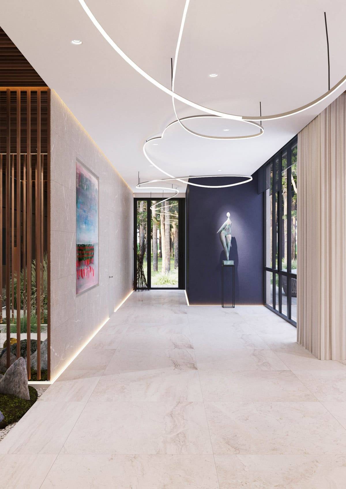 Конструкция и форма потолка – не менее мощный инструмент дизайна чем цвет. Различные формы натяжных потолков для зала позволяют визуально изменить пропорции, увеличить высоту или расширить.