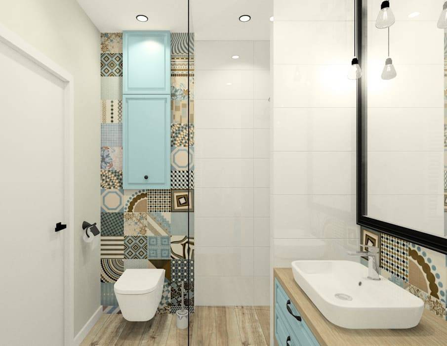 На фото справа интерьер синего санузла с шахматным полом диагональной укладки, такой прием визуально раздвигает стены.