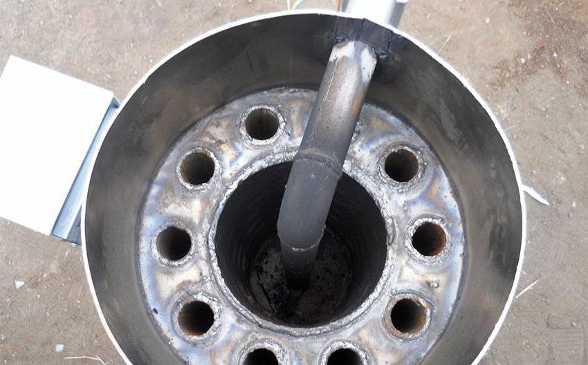 - Средний отсек. Это перфорированная труба. Отверстия необходимы для неограниченного поступления воздуха. Для изготовления этой и остальных частей берут металл 5,5 мм и толще.