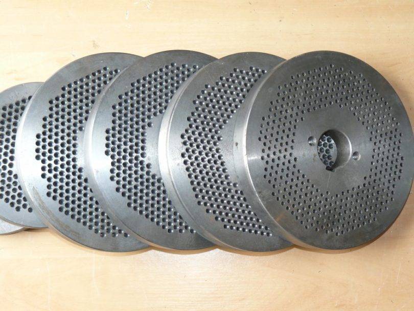 Плоская матрица произведена по той же технологии, но она имеет форму диска с перфорацией, куда таким же методом впрессовывается масса. Здесь каналы для прессования обладают цилиндрической формой, отверстия имеют размер 8–10 мм.