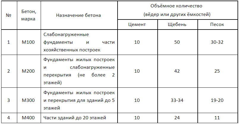 Однако непосредственно при постройке удобнее пользоваться объемными соотношениями. Универсальной мерой для компонентов является ведро объемом 10 литров.