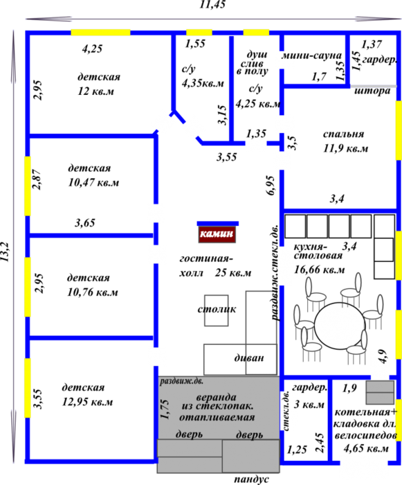Дом площадью 12х13 м. Пространства хватит для любой планировки мансарды с двускатной крышей; проекты такой площади оптимальны для комфортного размещения семьи из трех поколений. Под крышей достаточно места, чтобы обустроить уютную спальню, светлую детскую и ванную; останется место и для кабинета.