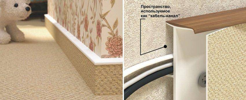 - Наличие кабель-канала делает изделие просто незаменимым в ситуациях, когда необходимо скрыть различные провода, но нет возможности выполнять штробление или использовать другие декоративные накладки. Отличительной чертой этого вида является то, что доступ к спрятанным элементам осуществляется без особых затруднений – необходимо лишь снять заглушку.