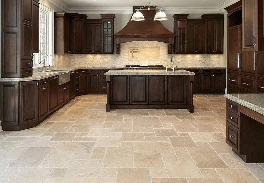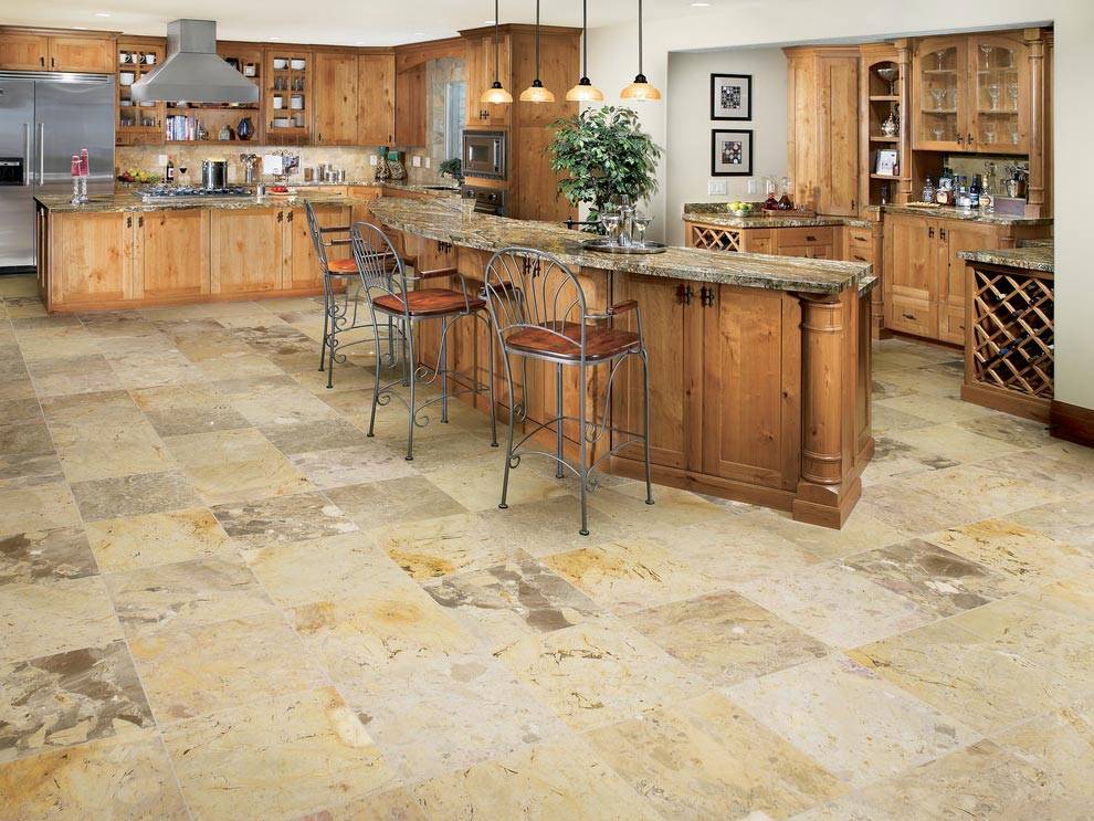 Вариант дизайна кухни с керамической плиткой на полу.