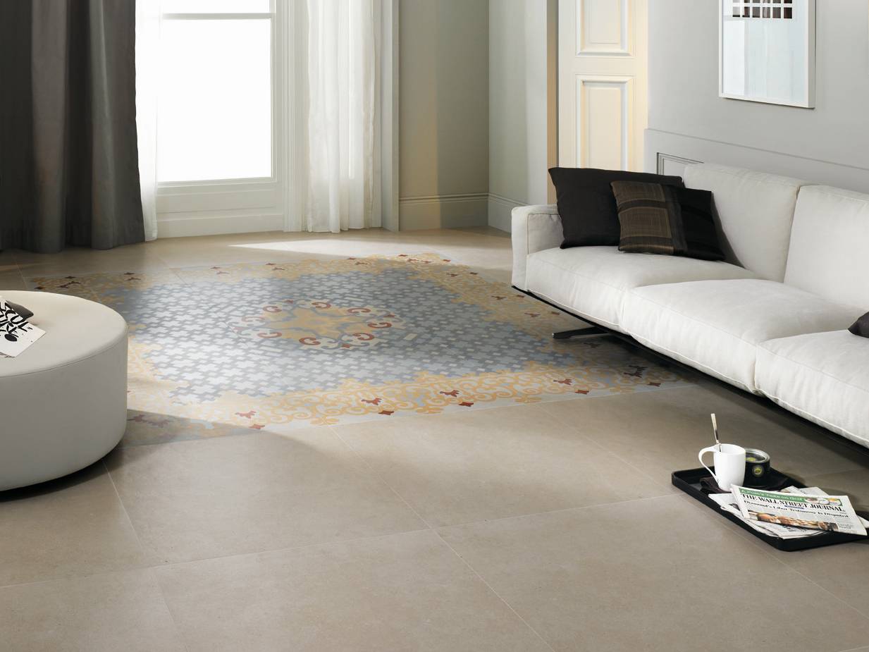 Зонирование пола в интерьере разной плиткой.