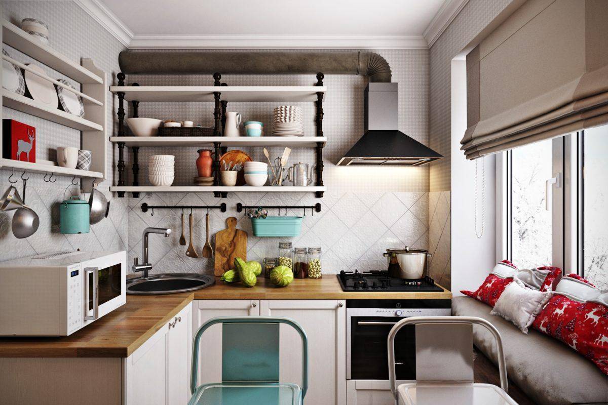 Чаще Лофт выбирают для крупных кухонь (в том числе совмещённых с гостиной), но его облегчённый вариант подойдёт и тесному помещению. Стены могут быть отделаны штукатуркой под бетон или стилистически нейтральным покрытием типа светлой моющейся краски.