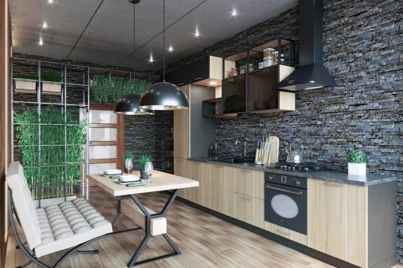 Фартук оформляют плиткой под кирпич или камень. Керамику же используют и для напольного покрытия. Мебель лучше выбирать деревянную; хорошо будет смотреться сочетание светлого и тёмного дерева в одном помещении.