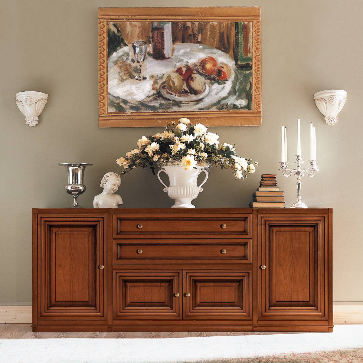 - В случае с гостиной следует остановить свой выбор на низкой модели с разноплановыми ящиками. На поверхности можно установить телевизор. Следовательно, оптимальным местом расположения выступает центральная часть свободной стены. Если же комоды из дерева выполняют функцию хранения посуды, их лучше разместить в непосредственной близости от обеденной зоны.