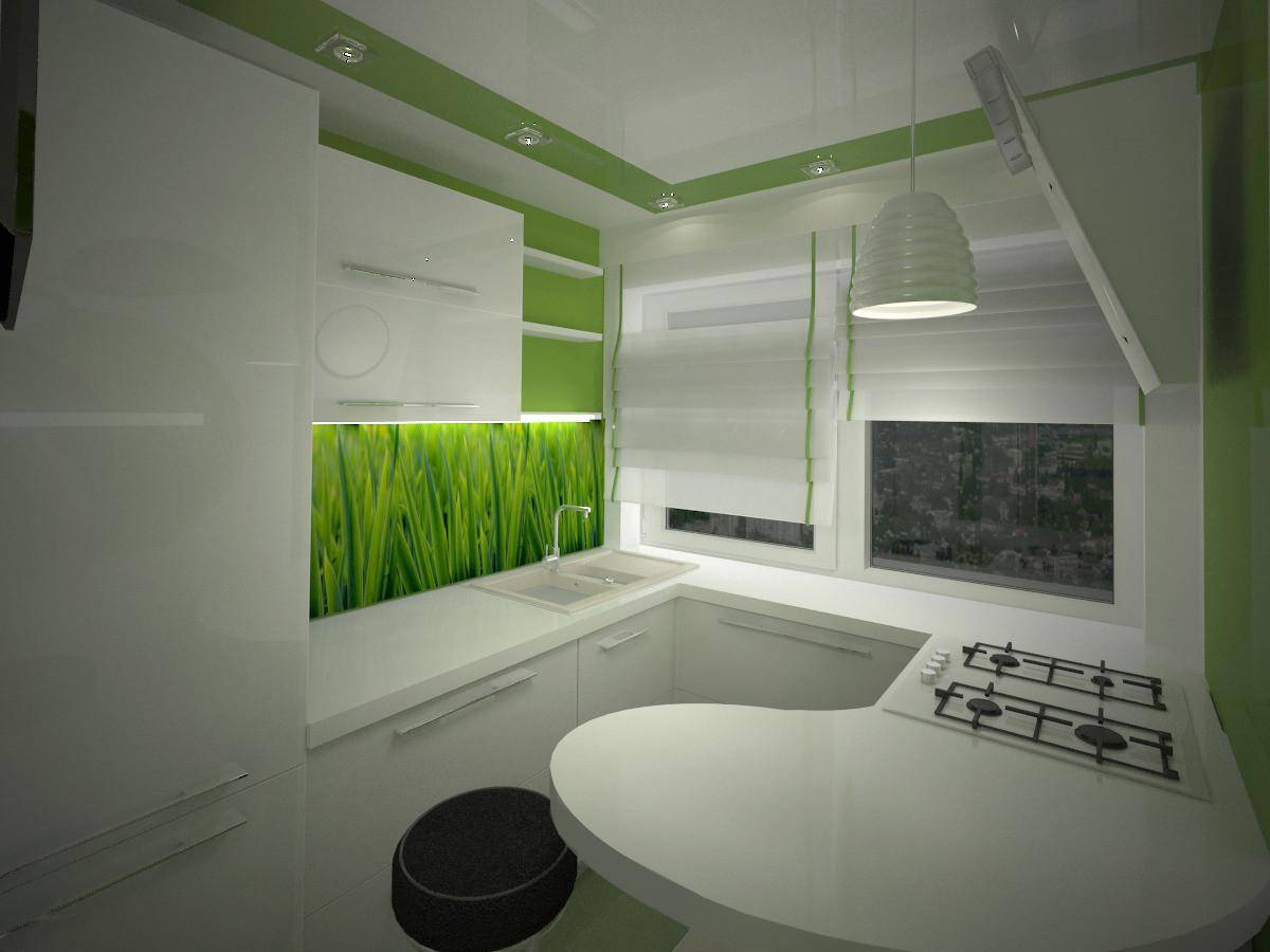 Для отделки пола хорошо подойдёт плитка, а потолок лучше сделать глянцевым со встроенными светильниками. Технику лучше прятать за фасадами. Интерьер не следует загромождать текстилем и декором; хорошо подойдут жалюзи, рулонные шторы, 1-2 декоративных растения или цветка.