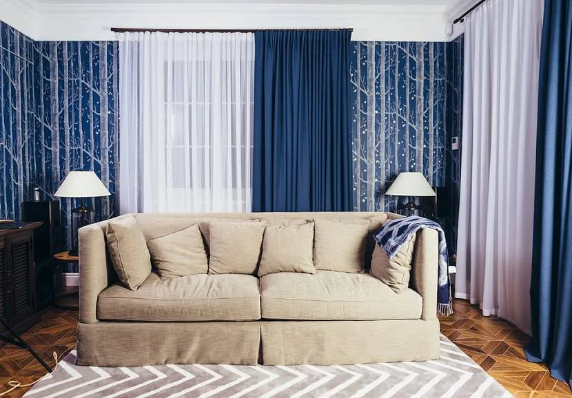 Синий цвет настолько неординарен, что яркая обивка мебели и пестрые шторы могут смотреться рядом с синими стенами неуместно. Поэтому вы не ошибетесь, если повесите белые или бледно-голубые шторы под синие обои. Вместе с тем, в сочетании с синим не рекомендуется использовать блеклые, невыразительные тона. На фоне чистого насыщенного цвета неяркие детали будут выглядеть тускло и непривлекательно, окно потеряется, и будет иметь вид грязного пятна.