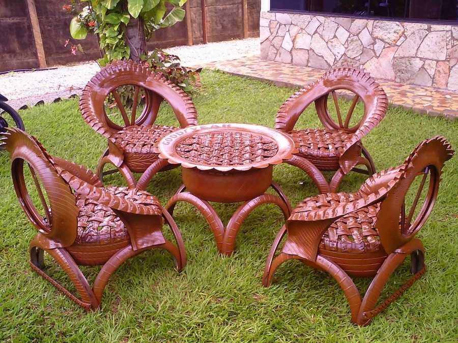 Можно сделать удобное кресло-качалку. Сначала подготавливается каркас из дерева. Шину нарезают на полоски, из которых путем переплетения получают полотно. Благодаря жесткому каркасу, такое кресло очень устойчивое и удобное.