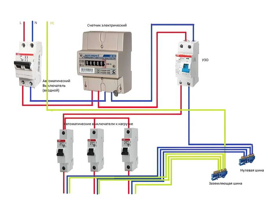 Распределение электроэнергии начинается с вводного двухполюсного автомата, который выполняет функцию защиты счетчика и отходящих линий, а также в качестве устройства отключения счетчика при ремонте или замене. Однако в реальной жизни вводной автомат может быть установлен за счетчиком (по ходу электроэнергии). Делается это с целью ограничения доступа к счетчику. После автомата фазный (L) и нулевой (N) проводники подключаются к соответствующим входным зажимам счетчика — 1 и 3. Выход счетчика (нагрузка) — это зажимы 2 (L) и 4 (N). От этих зажимов проводники подключаются к противопожарному УЗО, после которого электроэнергия распределяется по однополюсным автоматическим выключателям, а нулевой рабочий проводник заводится на общую нулевую шину.