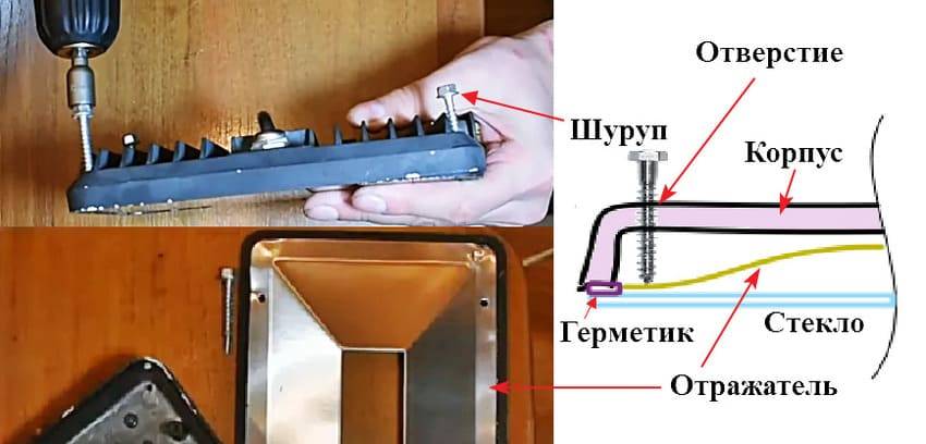 Шурупом необходимо давить не на само стекло, чтобы оно не треснуло, а на металлический отражатель в месте, где он контактирует со стеклом. Это кардинальный способ как разобрать прожектор.